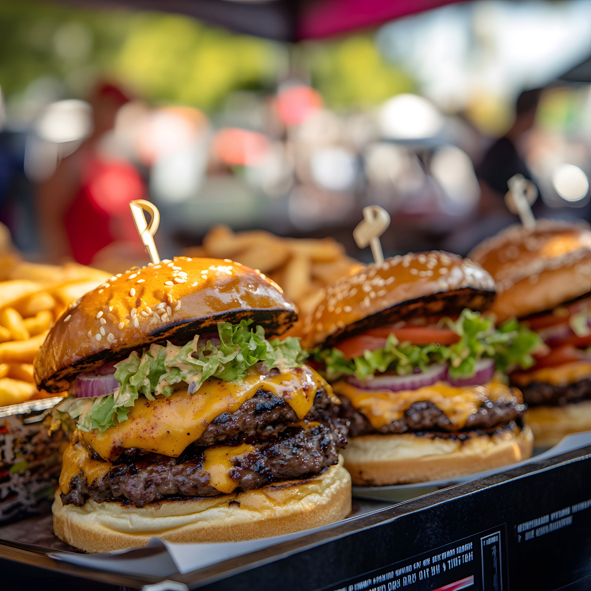 Hambúrguer bem feito, servido quente e com aquele clima de festa.